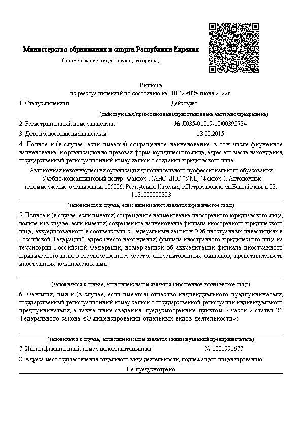 Адрес осуществления образовательной деятельности: 185005, Республика Карелия, г. Петрозаводск, ул. Ригачина дом 37А, офис 303